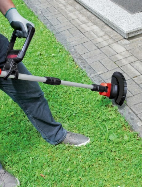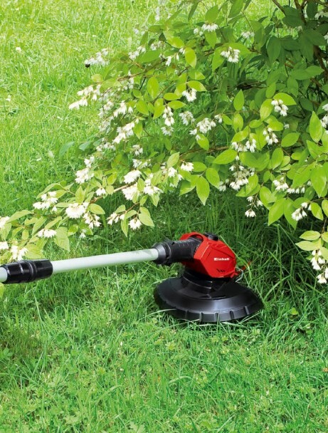 Электрокоса аккуратно подстригает мягкую траву, жесткие стебли сорняков и молодые побеги кустарника.