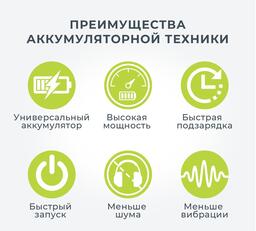 Комплектация- Триммер; - пильный диск; - наплечный ремень; - инструкция по эксплуатации; - гарантийный талон; - картонная коробка; *аккумулятор и зарядное устройство не входят в комплект поставки