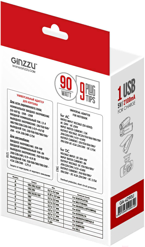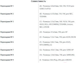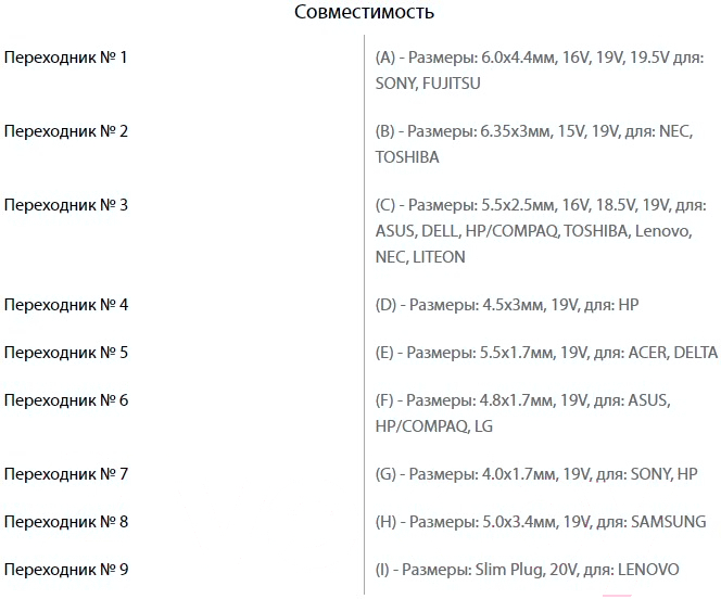 Размер штекера4.0×1.7 мм (HP, Sony), 4.5×3.0 мм (HP), 4.8×1.7 мм (Asus, HP, Compaq, LG), 5.5×1.7 мм (Acer, Delta), 5.5×2.5 мм (Asus, Dell, HP, Compaq, Toshiba, Lenovo, NEC, Liteon), 5.0×3.4 мм (Samsung), 6.0×4.4 мм (Sony, Fujitsu), 6.35×3.0 мм (Toshiba, NEC)