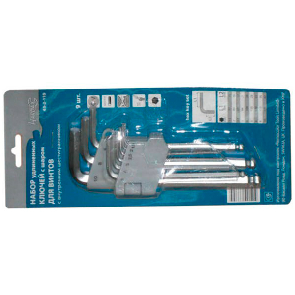 Набор имбусовых ключей Hardax 43-2-119 состоит из следующих ключей: 1,5 мм, 2 мм, 2,5 мм, 3 мм, 4 мм, 5 мм, 6 мм, 8 мм, 10 мм.