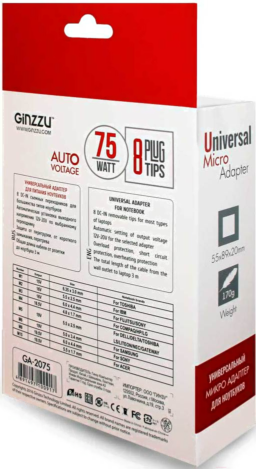 • Совместимые марки ноутбуков Acer, Dell, HP, Samsung, SONY, Toshiba, NEC, Compaq, Fujitsu, LG