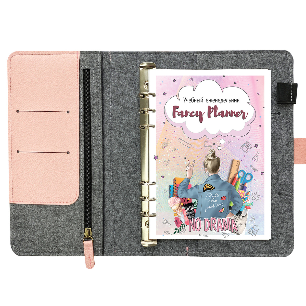 Ежедневник А5 Учебный на 6 кольцах (фетр, серый с розовым). Fancy Planner