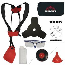 В комплект с инструментом входят не только 2 режущих блока, и ранцевый жилет, но и набор ключей для сборки и разборки мотокосы и ее блоков, сумка для этих ключей. Защитный кожух, который обеспечивает безопасность оператора, а также стационарный металлический нож, который необходим для ограничения длины лески и обрезки толстых веток.