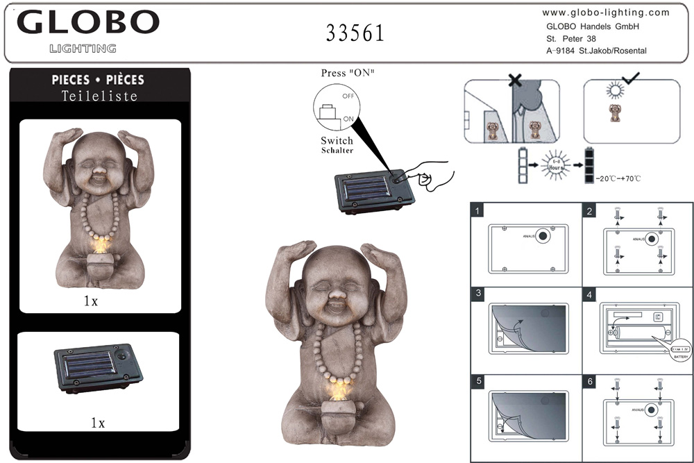 - Дополнительные характеристики светильник в виде Будды; выключатель Solar