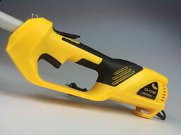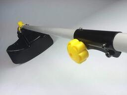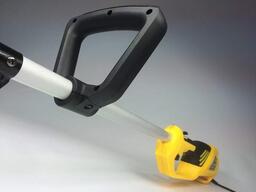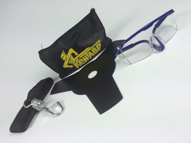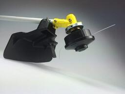Электротриммер, для продолжительной комфортной работы оператора, оснащен эластичным наплечным ремнем. С помощью фиксирующего карабина ремень подгоняется под рост и комплекцию пользователя. В наборе режущих инструментов присутствует усиленная шпуля с леской, материал которой легко выдерживает внезапные удары во время работы. С помощью лески с диаметром 1,6 мм можно скашивать сочную высокую растительность с проходом в диаметре до 380 мм. Для обрезания более толстых стеблей мелкого кустарника или сорняков в комплекте представлен 3-х зубчатый нож, который сделан из прочной стали и не требует частой заточки. Диметр прохода с ножом составляет 255 мм. Сумка с набором ключей вмещает все инструменты необходимые в процессе работы или технического обслуживания. Защитный кожух большого диаметра защищает оператора от летящих комков грязи или остатков стеблей. Для этих же целей, в комплектацию входят защитные очки.