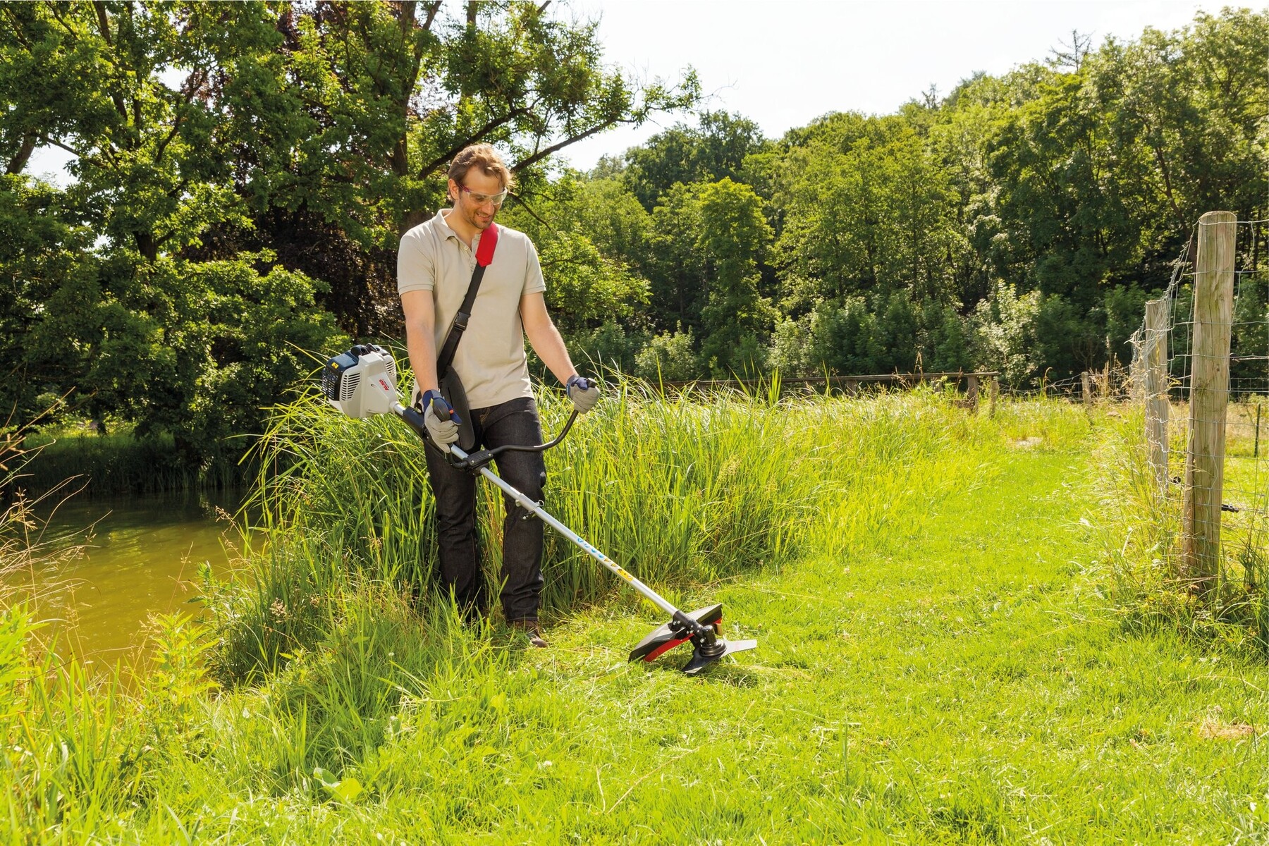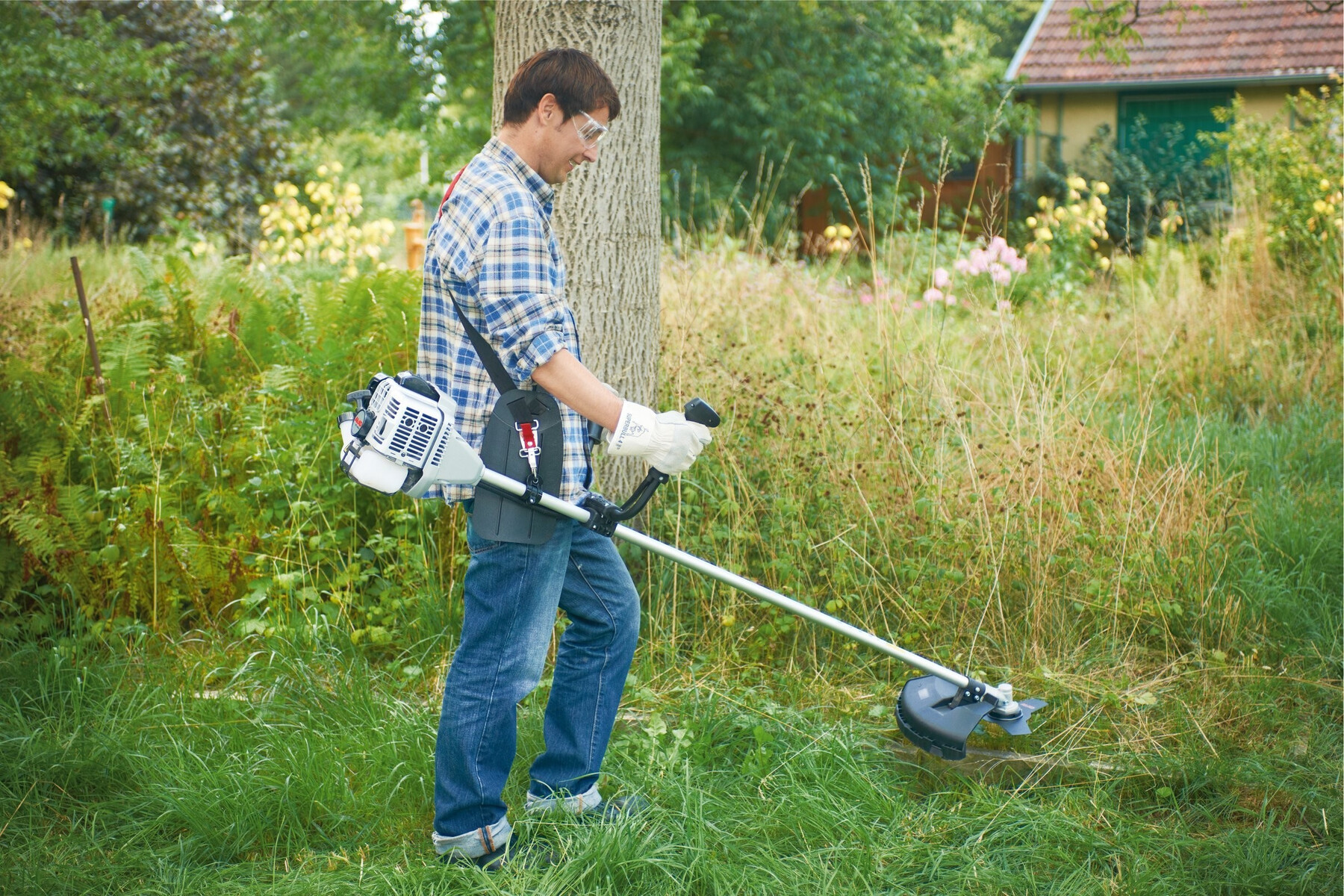 Ручной инструмент регулируется на плечах оператора с помощью плечевого ремня. Эргономичный двойной плечевой ремень равномерно распределяет вес на туловище и руки для легкой работы. Правильному удержанию инструмента помогает рабочая ручка, велосипедного типа. На продолжительность работы пользователя влияет правильно выставленная ручка и подтянутость плечевого ремня. Для комфортной работы режущий блок должен находиться на 10-20 см от поверхности земли.