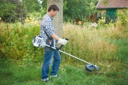 Универсальный инструмент с рабочим весом в 7,8 кг удобно располагается в руках оператора. Бензиновое топливо позволяет удаляться от дома на большие расстояния. Особенность конструкции не требует ровной обрабатываемой поверхности, любые овраги, склоны, выемки не создадут помех во время работы. Бензиновый инструмент создан для подравнивания газонов, уборки молодой травы и сорняков, подравнивания растительности около фундаментов и изгородей, вокруг деревьев.