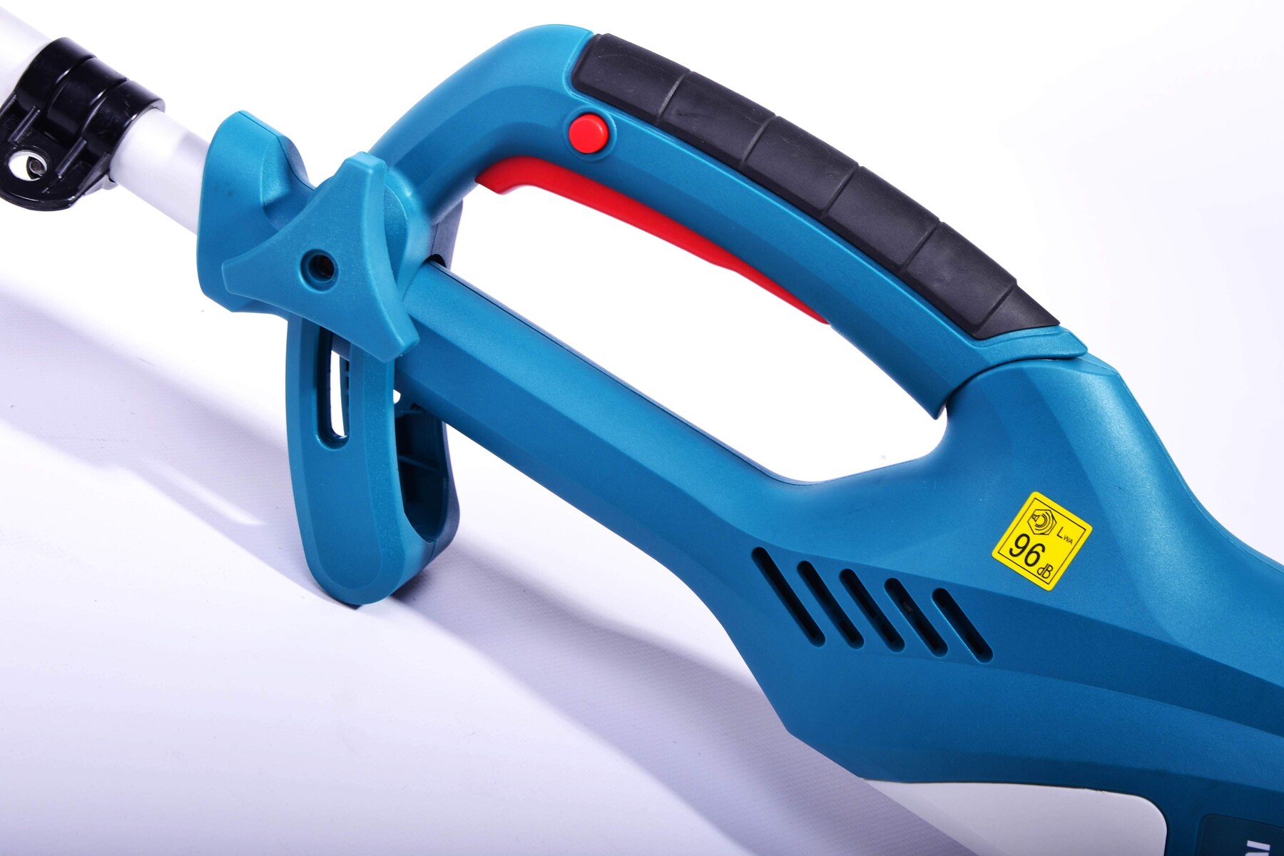 Электрокоса состоит из двух половинок, которые надежно скрепляются фиксатором. Разборная конструкция позволяет значительно экономить место во время хранения или перевозки. Тщательная подгонка элементов штанги позволяет с уверенностью говорить о защищенности внутреннего стального вала. Алюминиевая штанга обладает достаточной прочностью, не деформируется при столкновении с твердыми предметами, не поддается коррозии.