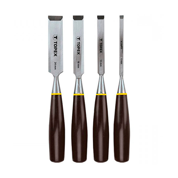 Стамески по дереву, набор Topex 09A310 содержит в себе 4 штуки, размеры которых: 6, 12, 18, 24 мм.