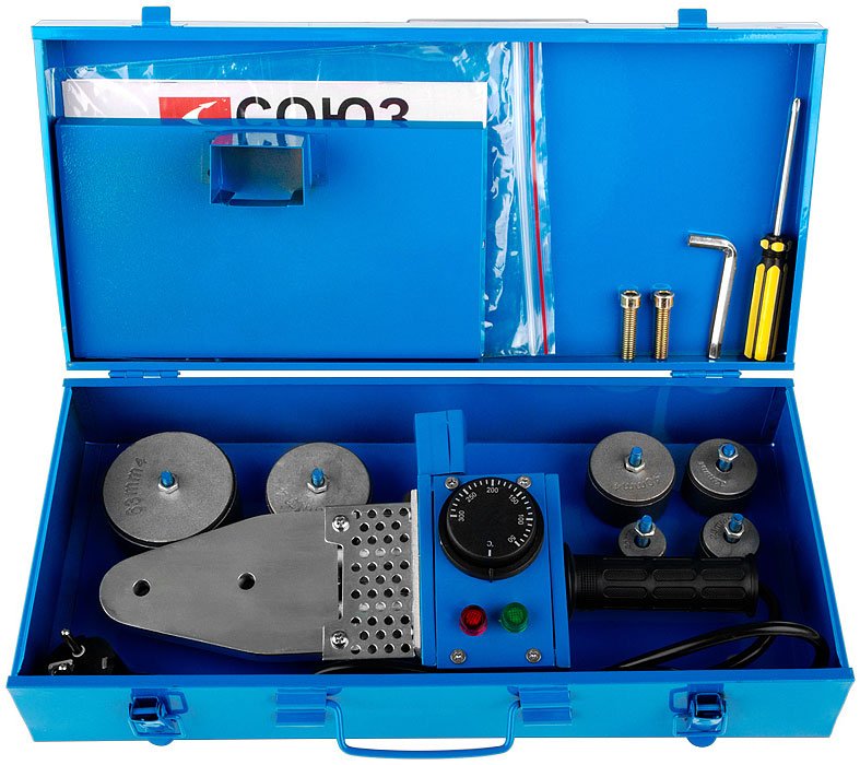 Аппарат для сварки пластиковых труб различного диаметра из большинства видов полимерных материалов потребляемой мощностью 2000 Вт. 6 насадок. Плавная регулировка температуры 50-300 °С. Длина шнура питания 2 м. Комплектация: насадки (20 мм, 25 мм, 32 мм, 40 мм, 50 мм, 63 мм), ножницы для резки труб, шестигранный ключ, отвертка, рулетка, перчатки, подставка, металлический кейс.