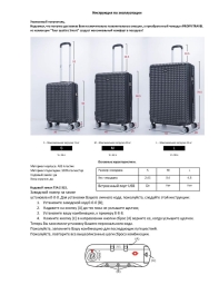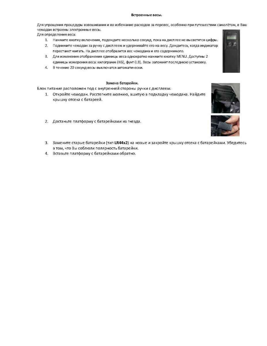 • Особенности: Багажные ремни в главном отделении, Выдвижная ручка, Жесткое дно, Замок, Колеса, Разделитель в главном отделении, Эргономичная ручка для переноски, Встроенные весы