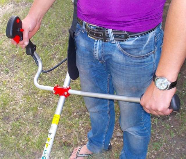 После достижения сбалансированного положения необходимо отрегулировать высоту режущего ножа. Это достигается с помощью фиксатора карабина. Фиксатор надо передвигать вверх или вниз по штанге, а выбрав нужное положение, его необходимо надежно закрепить крепежным винтом. Наиболее оптимальное положение режущего блока от земли составляет около 10-20 см. Раздельная рукоятка держится на штанге, с помощью кронштейна и состоит из двух частей, каждая из которых регулируется отдельно. Регулируя правую и левую ручки, достигается максимально комфортный захват оператора.