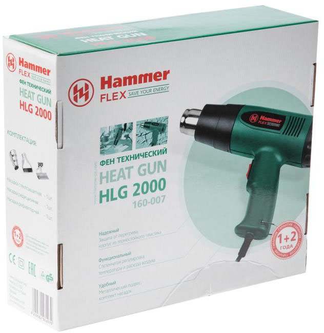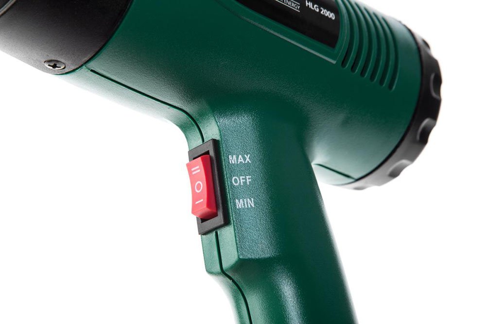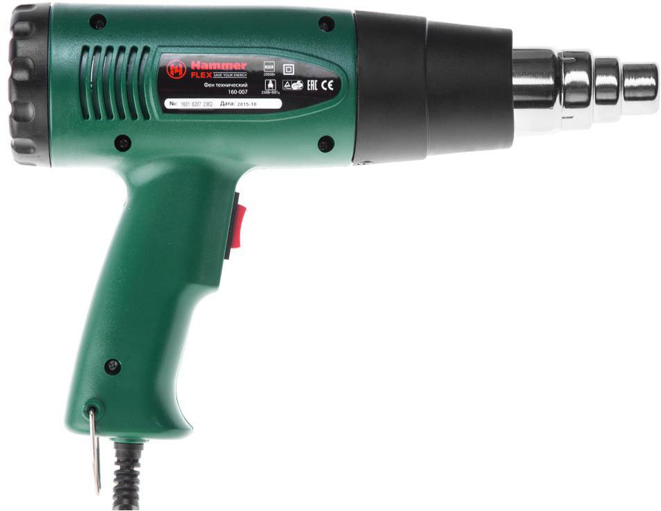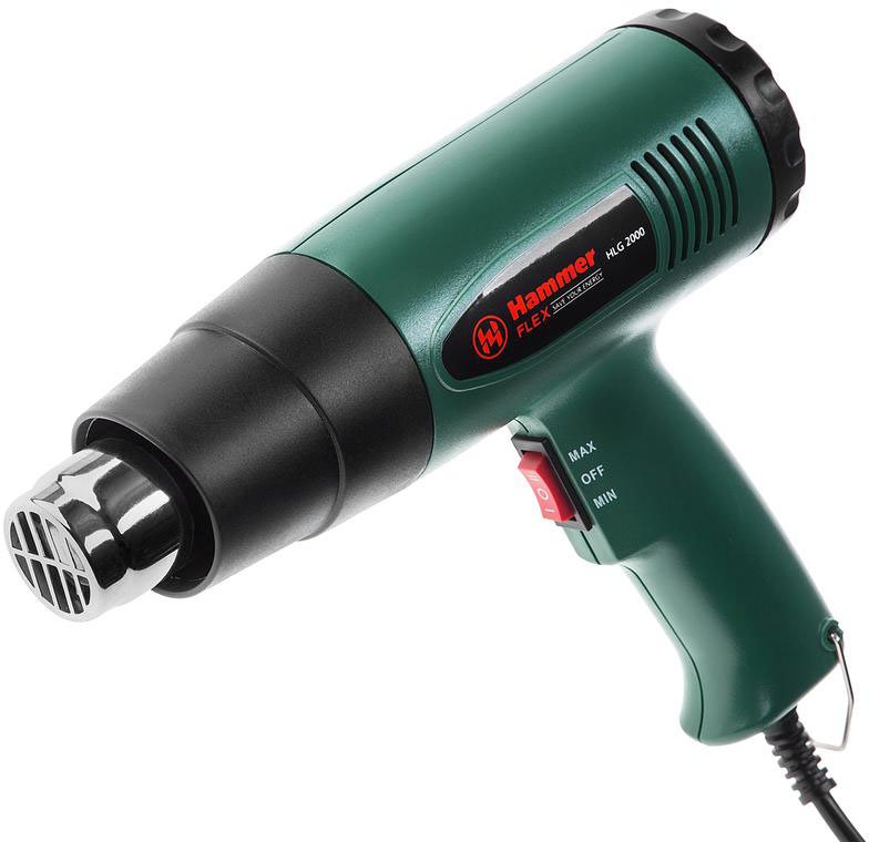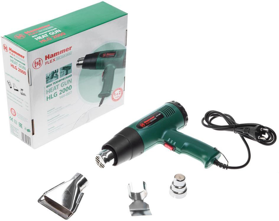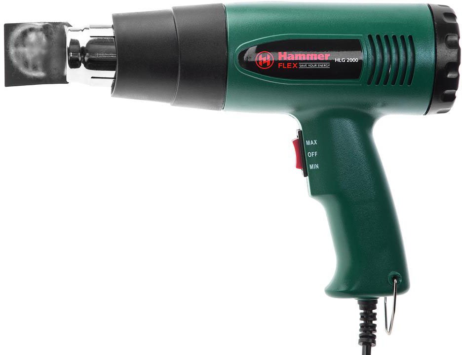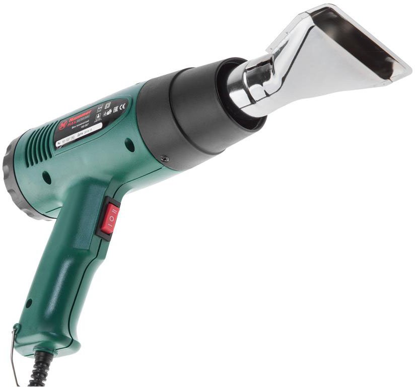 Промышленный фен мощностью 2000 Вт. Рабочая температура: 450/600 °С. Воздушный поток: 300/500 л/мин. Вес: 0,7 кг. Насадки в комплекте.