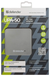 Сетевое зарядное устройство Defender UPA-50 имеет 4 порта USB. Выходные параметры устройства достаточны для питания различных типов портативной электроники. Встроенная микросхема системы распределения токов определяет тип заряжаемого устройства и сама назначает наиболее безопасный и эффективный ток для зарядки устройства.