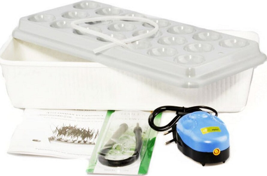 - Комплектация Контейнер для воды – 1 шт. Распылитель воздуха – 1 шт. Силиконовый шланг – 1 шт. Компрессор – 1 шт. Крышка с ячейками – 1 шт.