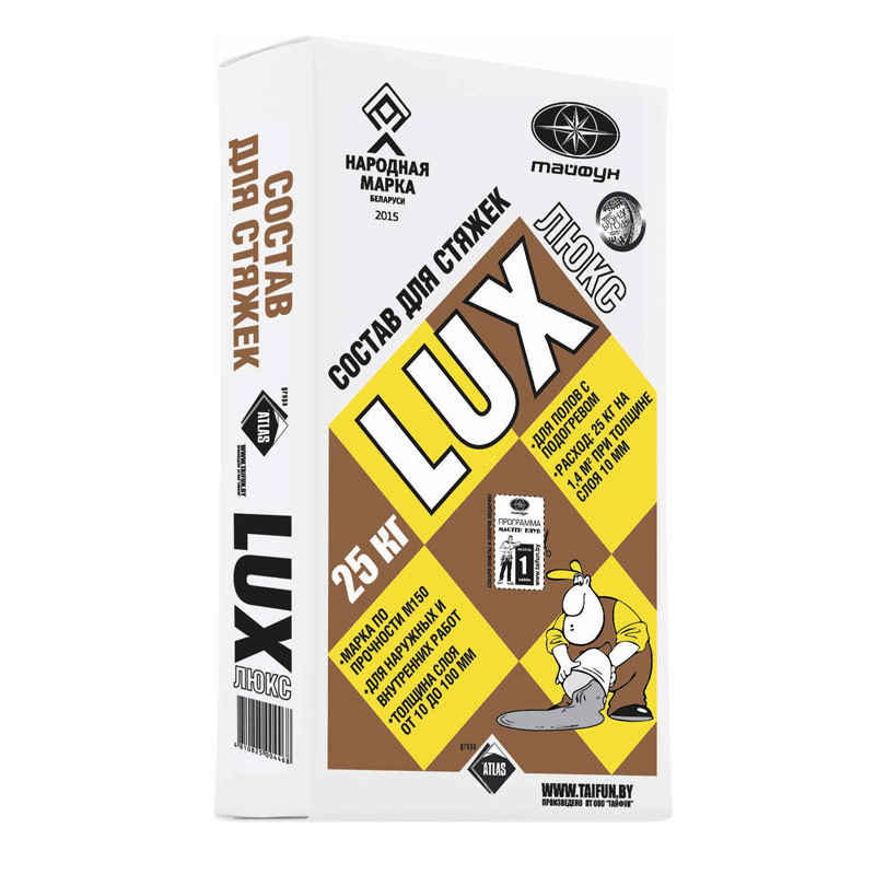 Смесь для стяжки пола Тайфун Люкс 25 кг применяется для внутренних и наружных работ. Готовый раствор наносится слоем 10-100 мм, количество слоёв не ограничено. Подходит для полов с подогревом. Мешка сухой смеси будет достаточно на 1,4 м2 при толщине слоя 10 мм.