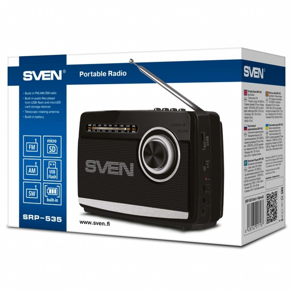 Лінійка радіоприймачів SVEN поповнилася моделлю SRP-535. Пристрій має вбудований FM / AM / SW радіо, поворотну телескопічну антену, можливість відтворення музики з USB flash і microSD карт пам'яті і вбудовану батарею.