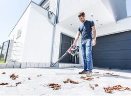 Садовый пылесос в корпусе небольших размеров весит чуть больше 2 кг, благодаря чему пользователь не ощутит быстрого утомления в процессе уборки, а также сможет оперировать в стесненном пространстве. Для фиксации батареи предусмотрено слайдерное крепление.