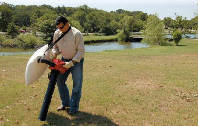 С помощью всасывающей насадки воздуходувка переходит в режим пылесоса. Мощная струя захватывает мелкий мусор, траву, листья и втягивает его в объемный мешок.