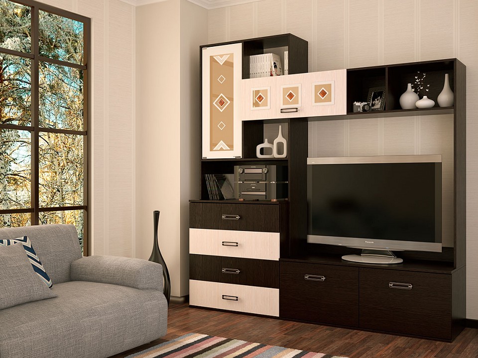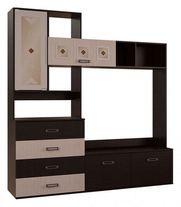 • Конструкция с выдвижными ящиками,с открытыми полками,с распашными дверками