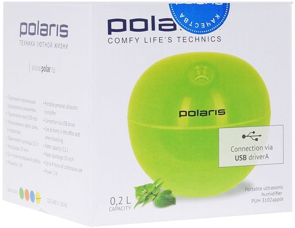 - Описание (полное) Увлажнитель воздуха Polaris PUH 3102 apple изготовлен в виде небольшого яблочка синего цвета. Его можно разместить на столе, полочке или даже в автомобиле. Устройство имеет ультразвуковой тип функционирования. Небольшая мембрана создает частые колебания, превращающие воду из резервуара в легкий туманный пар. Он распределяется по всему периметру комнат площадью до 10 м? и очищает даже самый спертый воздух.Polaris PUH 3102 apple имеет прочный резервуар с запасом в 0.2 л воды. Запаса хватает, чтобы беспрерывно увлажнять воздух в помещениях до 4 ч. Увлажнитель можно подсоединять к сети с использованием USB-кабеля. Расходует воду прибор по 50 мл/ч, потребляет 2 Вт энергии и не требует серьезных энергозатрат. Габариты увлажнителя – 10х10х10 см, а его вес – 0.3 кг.