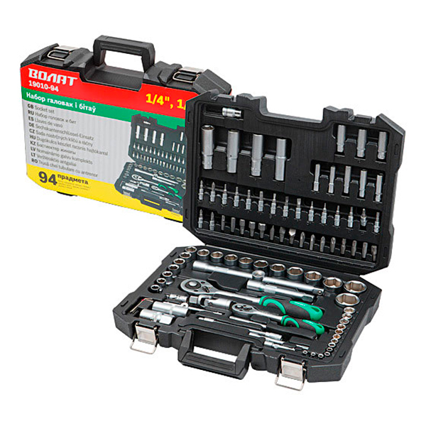 - Торцевые головки 1/2" (32 мм), 1/4" (4-14 мм), 1/2" (14-19 мм глубокие), 1/4" (13 мм глубокие)