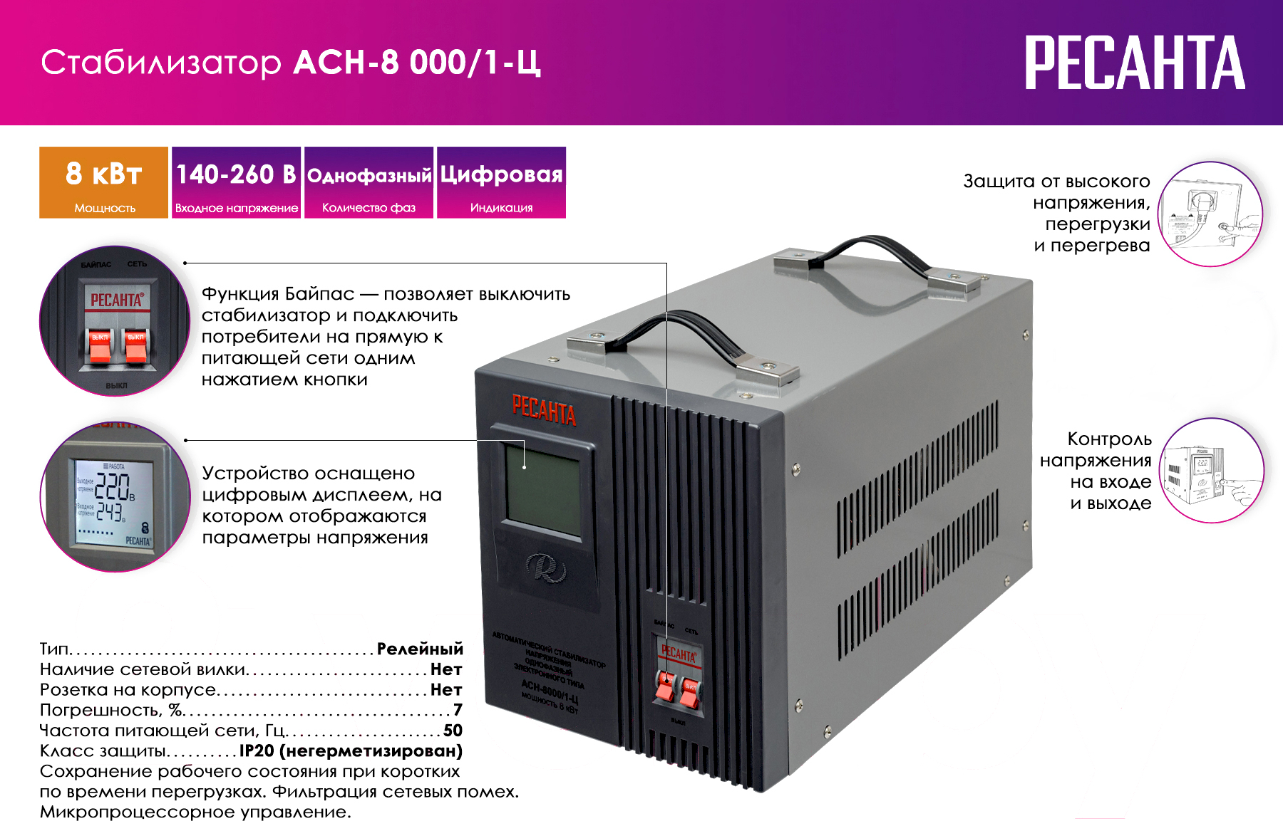 Стабилизатор напряжения Ресанта АСН-8000/1-Ц (63/6/7)