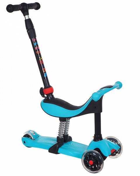 - Описание Трехколесный самокат 4 в 1 Suncolor Mars kids голубой станет любимым развлечением для ребенка. Он легко трансформируется меняясь кардинально и выполняя разные функции. ОСОБЕННОСТИ САМОКАТА: яркий и красочный дизайн 4 варианта использования алюминиевая ручка руля регулируется по высоте. Ее можно устанавливать как впереди, так и сзади на сиденье резиновые грипы: резиновые пластиковая платформа достаточно широкая и удобная. Она не скользит чтобы затормозить, нажмите на заднее колесо все колеса сделаны из прозрачного полиуретана, внутри которого есть светодиоды. Колеса светятся во время движения съемное сиденье имеет удобную форму и небольшие литые ручки пружинная амортизация ВАРИАНТЫ ИСПОЛЬЗОВАНИЯ ИЗДЕЛИЯ: самокат Санколор Марс Кидс можно использовать вместо коляски, толкая за ручку, установленную сзади сиденья высокую ручку можно убрать и ездить, отталкиваясь ногами от земли, сидя на специальном сиденье возможна трансформация - ручку самоката впереди и сиденье классический самокат с возможностью регулировки высоты ручки