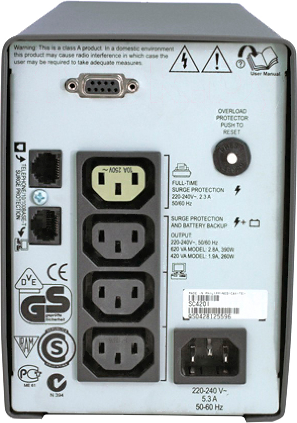 ИБП APC Smart-UPS SC 420VA (SC420I); Тип: ИБП; Тип ИБП: интерактивный (Line-Interactive); Эффективная мощность: 260 Вт; Номинальное входное напряжение: 120;286 В; Номинальное выходное напряжение: 230;230 В; Макс. время работы (100% нагрузки): 5.5 мин; Общее кол-во розеток: 4; Типы выходных разъемов: IEC-320-C14, RJ-11, RJ-45; Безопасность: защита от перегрузки, защита от короткого замыкания; Макс. время перезарядки батареи: 3 ч; Максимальный ток нагрузки: 5 А