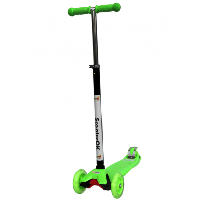 - Описание ScooterOk Plus - имеет мягкие силиконовые колеса со светодиодной подсветкой, задние сдвоенные колеса для большей устойчивости, регулируемую по высоте ручку (от 65 до 90 см), усиленную платформу с максимальной нагрузкой до 50 кг