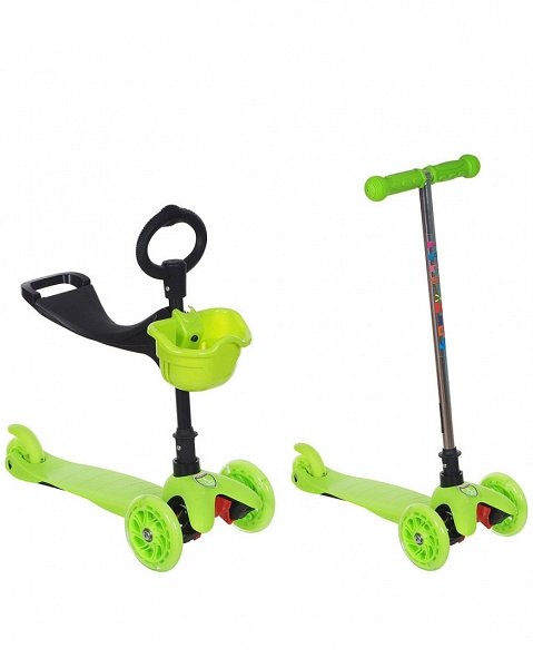 - Описание Самокат 3 в 1 Suncolor Mars kids light зеленый станет любимым транспортом для малыша. Он отличается яркой расцветкой и может трансформироваться, меняясь вместе со своим маленьким владельцем. ОСОБЕННОСТИ САМОКАТА: яркий и сочный цвет привлекает внимание в комплект входят 2 ручки руля. Первая сделана из алюминия и имеет T-образную форму, а вторая - круглая удобная пластиковая платформа колеса выполнены из прозрачного полиуретана, внутри которого есть светодиоды, светящиеся при движении предусмотрено сиденье, которое крепится на круглую ручку и превращает самокат в каталку конструкция позволяет использовать самокат в трех вариантах: обычный самокат, самокат с круглой ручкой, каталка с круглой ручкой