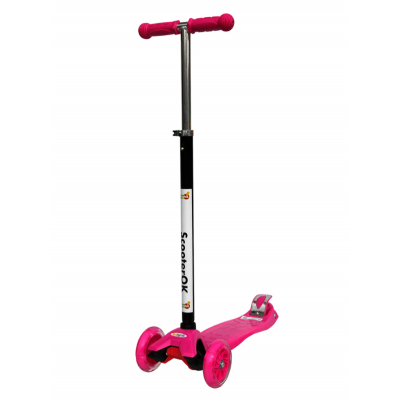 - Описание ScooterOk Plus - имеет мягкие силиконовые колеса со светодиодной подсветкой, задние сдвоенные колеса для большей устойчивости, регулируемую по высоте ручку (от 65 до 90 см), усиленную платформу с максимальной нагрузкой до 50 кг