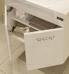 • с открытыми полками: могут дополнять конструкцию тумб с выдвижными ящиками или распашными дверками. Открытые полки могут использоваться как для хранения необходимых ванных принадлежностей, так и для декоративного оформления помещения с помощью дизайнерских аксессуаров;