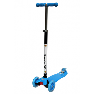 - Описание ScooterOk Plus - имеет мягкие силиконовые колеса со светодиодной подсветкой, задние сдвоенные колеса для большей устойчивости, регулируемую по высоте ручку (от 65 до 90 см), усиленную платформу с максимальной нагрузкой до 50 кг