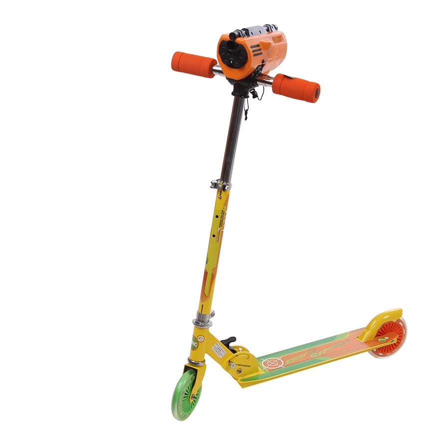 ОписаниеДвухколесный самокат Zinc ZC92231 имеет 2 колеса и предназначен для детей в возрасте от 2 лет. Основная фишка этой модели – специальный блок, позволяющий имитировать стрельбу из огнестрельного оружия. К данному блоку поставляется специальное крепление, позволяющее использовать его вместе с самокатом и отдельно. Стрельба осуществляется стрелами из мягкой пены, максимальная дальность полета которых составляет 5 м. Для нормального работы блока требуется 4 батарейки АА, не входящие в комплект поставки. Zinc ZC92231 имеет складной механизм, упрощающий транспортировку транспортного средства, а также регулируемый по высоте руль, который поможет подстроить самокат под ребенка любой комплекции и роста.