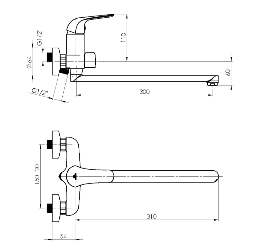 Kартридж керамический 35 мм, излив "G" 300 мм, вмонтированный в корпус дивертер, эксцентрики с тарелочками, держатель для душа, душевой шланг 150 см Con/Imp, душевая лейка, держатель лейки.