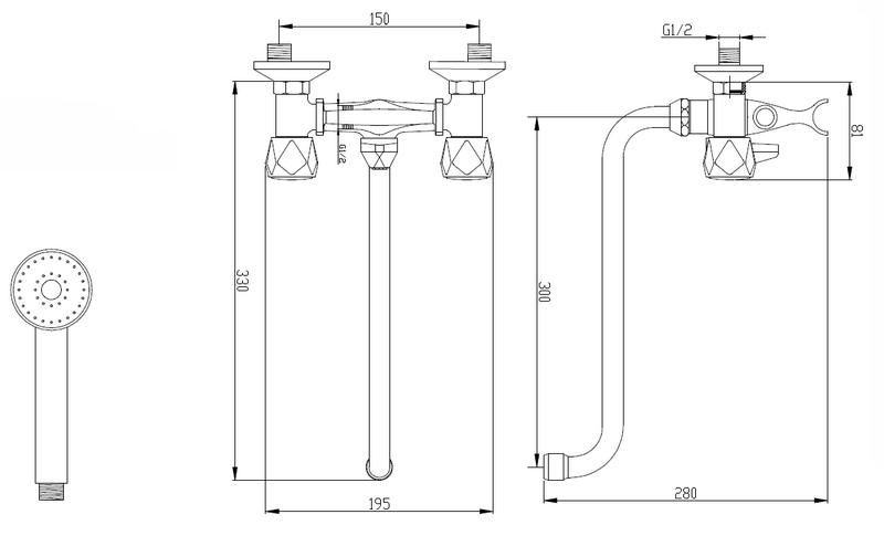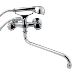 Смеситель для ванны двухрычажный, настенный, длина излива 30 см, цвет: хром, в комплекте шланг для душа 150 см и лейка душевая.