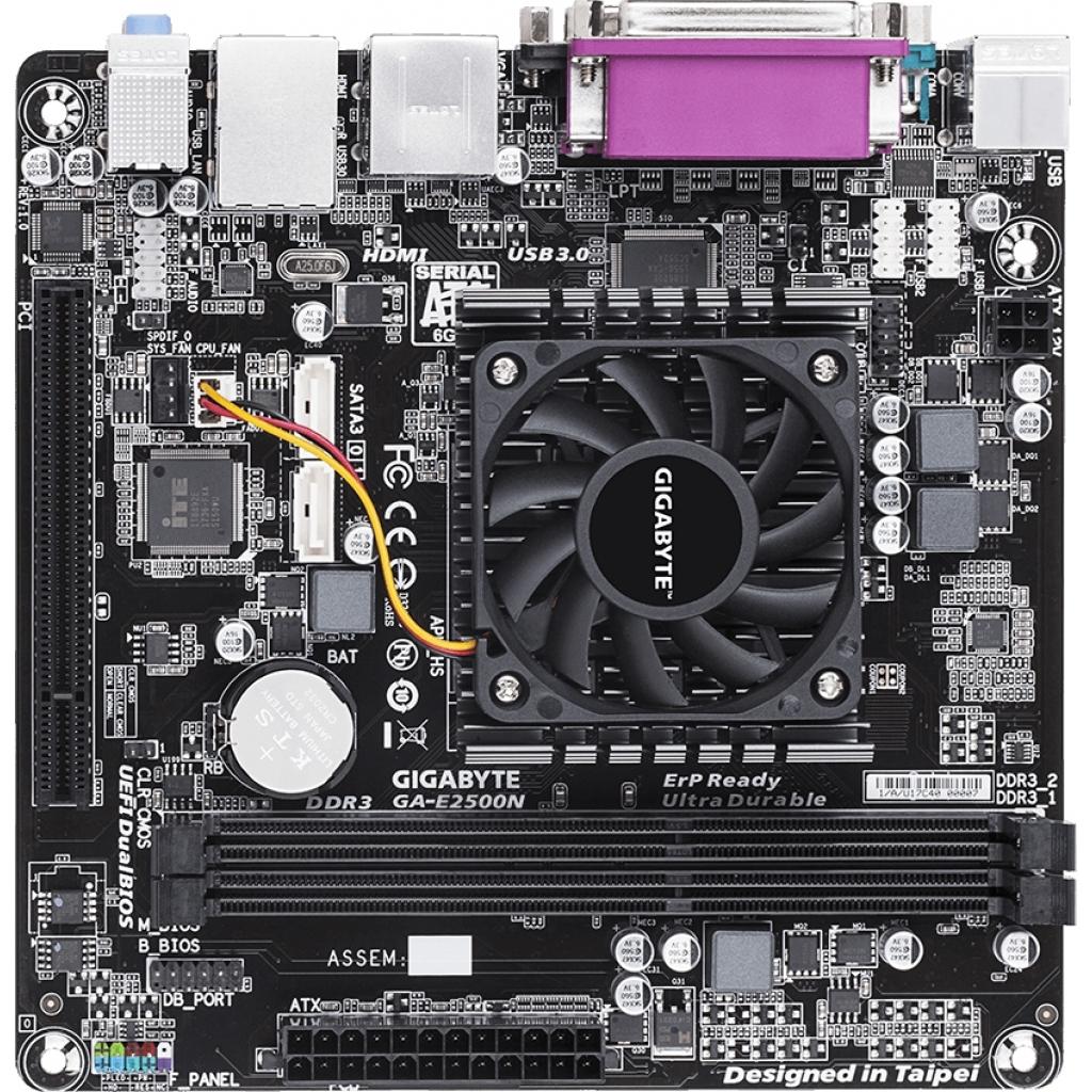 Материнська плата з форм-фактором Mini-ITX - це повністю інтегрована материнська плата для ПК з двоядерним процесором AMD серії E1 з графікою Radeon ™ HD 8240 (DX11.1). GIGABYTE E2500N, призначена для компактних ПК і систем малого форм-фактора для вирішення критично важливих завдань, а також являє собою надзвичайно ефективні цифрові розважальні системи. Можливості підключення включають цифрові і аналогові виходи дисплея через порти HDMI і D-sub, а порт HDMI забезпечують вбудовану підтримку дисплеїв з роздільною здатністю 4K.