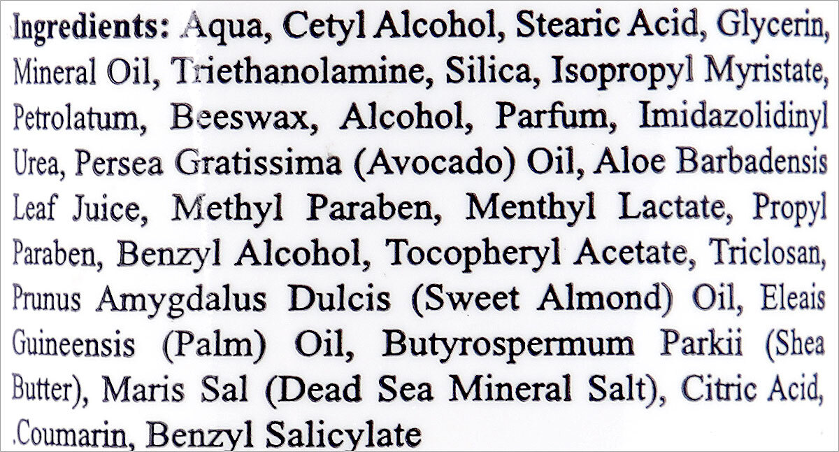 - Состав: Aqua (Water), Stearic acid, Glycerin, Mineral Oil, Isopropyl Myristate, Triethanolamine, Silica, Petrolatum, Beeswax, Alcohol, Parfum, Imidazolidinyl urea, Avocado Oil, Aloe barbadensis Extract, Methyl Paraben, Methyl Lactate, Propyl paraben, Sweet Almond Oil, Palm Oil, Shea Butter, Tocopheryl Acetate, Triclosan, Dead Sea Salt, Citric Acid, Benzyl Alcohol, Coumarin, Benzyl Salicylate, Methylchloroisothiazolinone, Methylisothiazolinone.