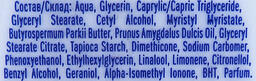 - Состав: Aqua, Glycerin, Caprylic/Capric Triglyceride, Glyceryl Stearate, Cetyl Alcohol, Myristyl Myristate, Butyrospermum Parkii Butter, Prunus Amygdalus Dulcis Oil, Glyceryl Stearate Citrate, Tapioca Starch, Dimethicone, Sodium Carbomer, Plenoxyethanol, Ethylhexylglycerin, Linalool, Limonene, Citronellol, Benzyl Alcohol, Geraniol, Alpha-Isomethyl Ionone, BHT, Parfum