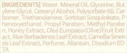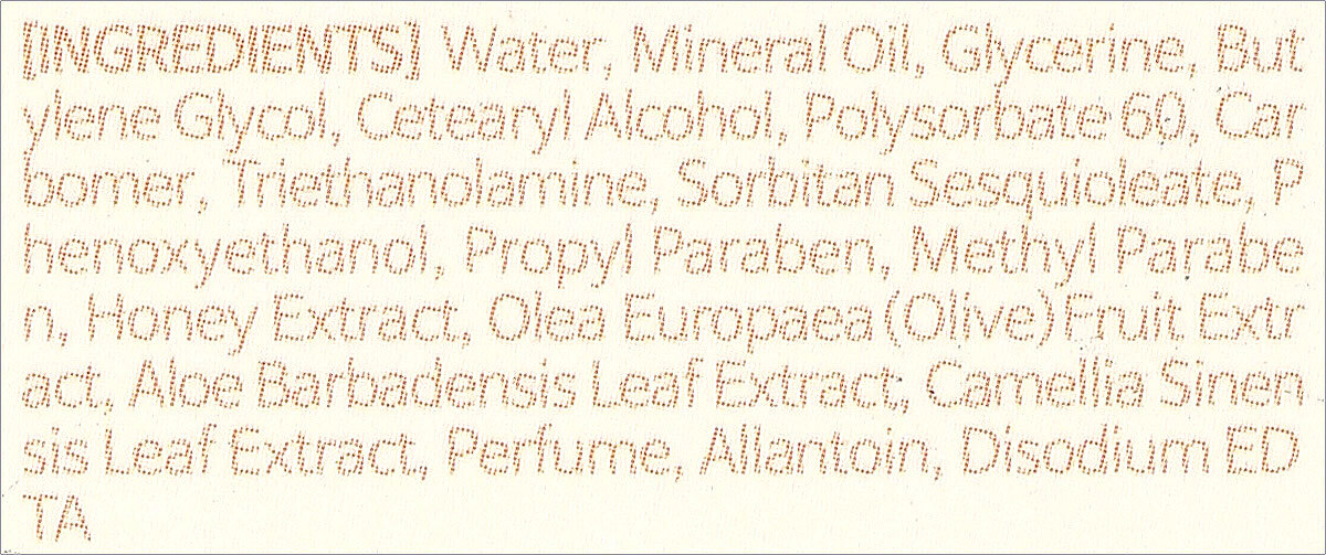 - Состав: Water, Mineral Oil, Glycerin, Cetearyl alcohol, Polysorbate 60, Carbomer, Triethanolamine, Phenoxyethanol, Methylparaben, Sorbitan sesquioleate, Propylparaben, Perfume, Honey Extract, Olea Europaea (Olive) Fruit Extract, Aloe Barbadensis Leaf Extract, Buthylene glycol, Camellia Sinensis Leaf Extract, Allantoin, Disodium EDTA.