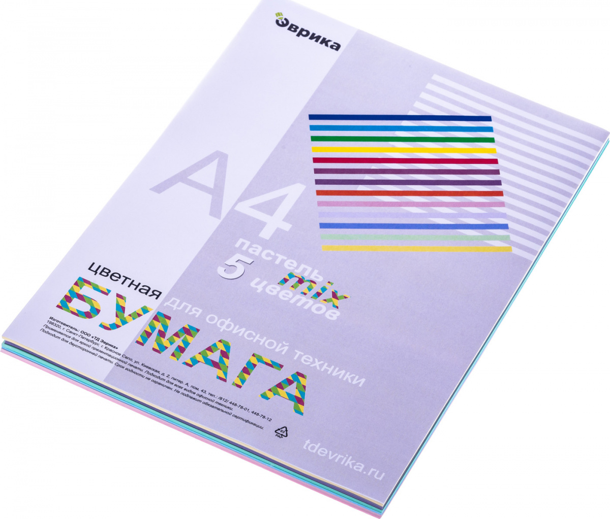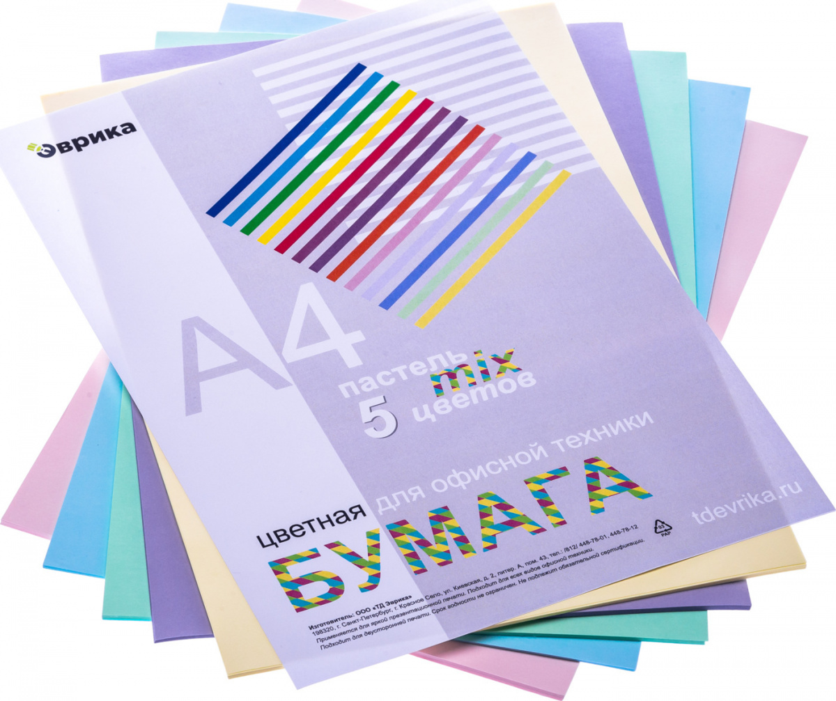 - Комплектация Бумага цветная Эврика, ПАСТЕЛЬ mix, А4, 80г/м2, 100л (5 цветов)