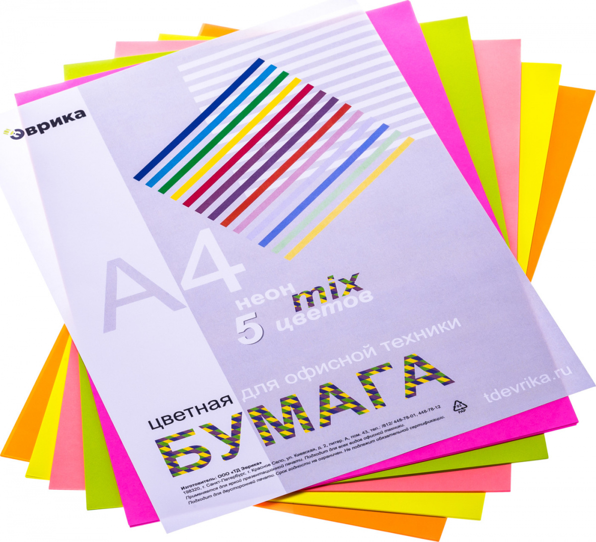 - Комплектация Бумага цветная Эврика, НЕОН mix, А4, 75г/м2, 250л (5 цветов)