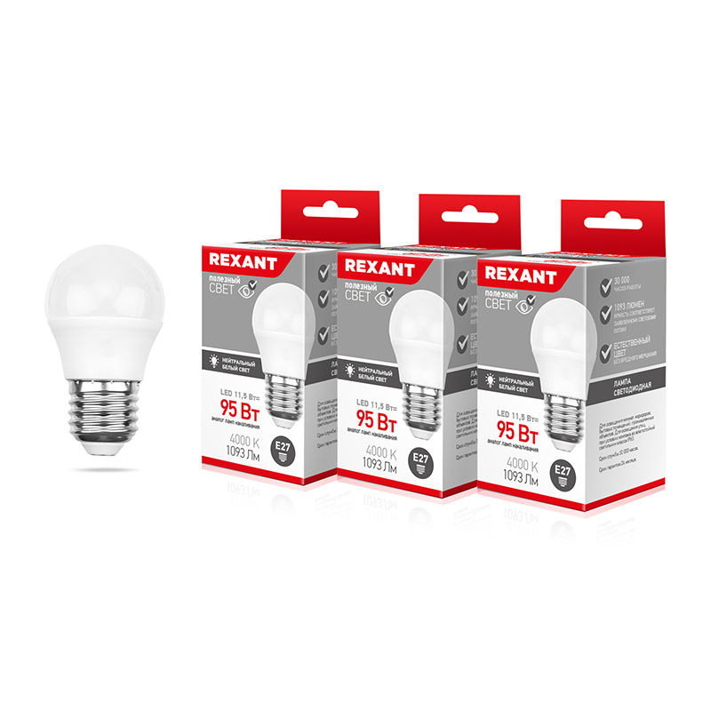 Лампочка REXANT 604-044e, Нейтральный белый свет, E27, 11.5 Вт, Светодиодная, 3 шт.