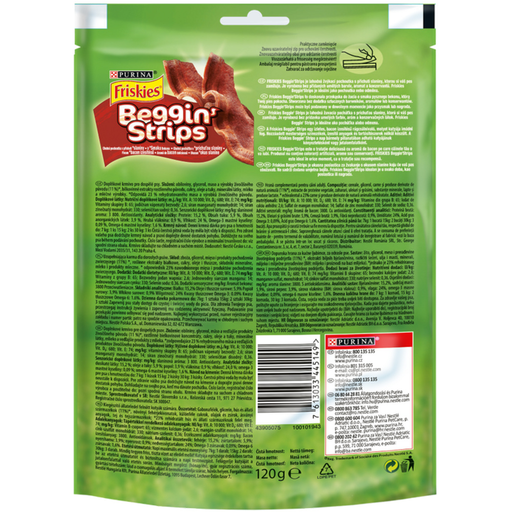 Лакомства для собак Friskies Beggin’ Strips содержат в себе витамины, Омега-3 и 6 и жирные кислоты.