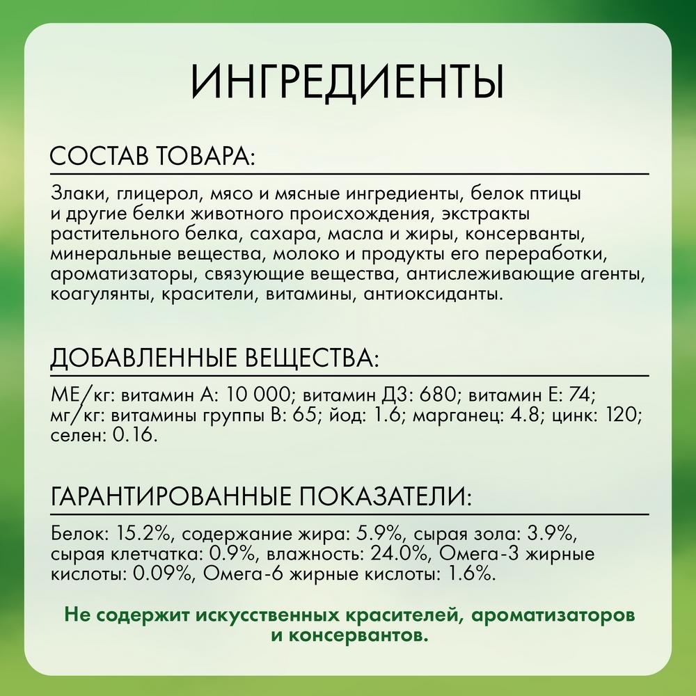 Ингредиенты: злаки, глицерол, мясо и мясные ингредиенты, белок птицы и другие белки животного происхождения, экстракты растительного белка, сахара, масла и жиры, консерванты, минеральные вещества, молоко и продукты его переработки, ароматизаторы, связующие вещества, антислеживающие агенты, коагулянты, красители, витамины, антиоксиданты.