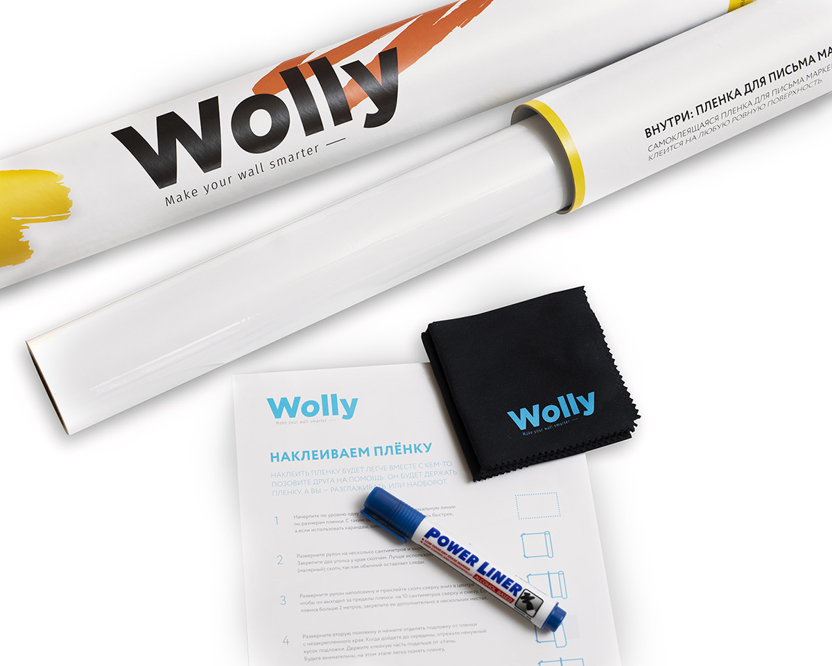 Комплектация:1. Доска маркерная Wolly PRO самоклеящаяся белая 122 x 90 см; 2. Маркер синего цвета; 3. Салфетка для стирания; 4. Инструкция по наклеиванию.