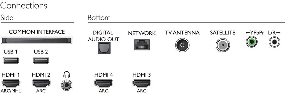 • Разъемы Поддержка MHL, Цифровой аудиовыход (S/PDIF), HDMI, Компонентный вход (Y/Pb/Pr), Композитный вход (AV), USB, Разъем для наушников, Слот CI, Вход RF, Ethernet (LAN)