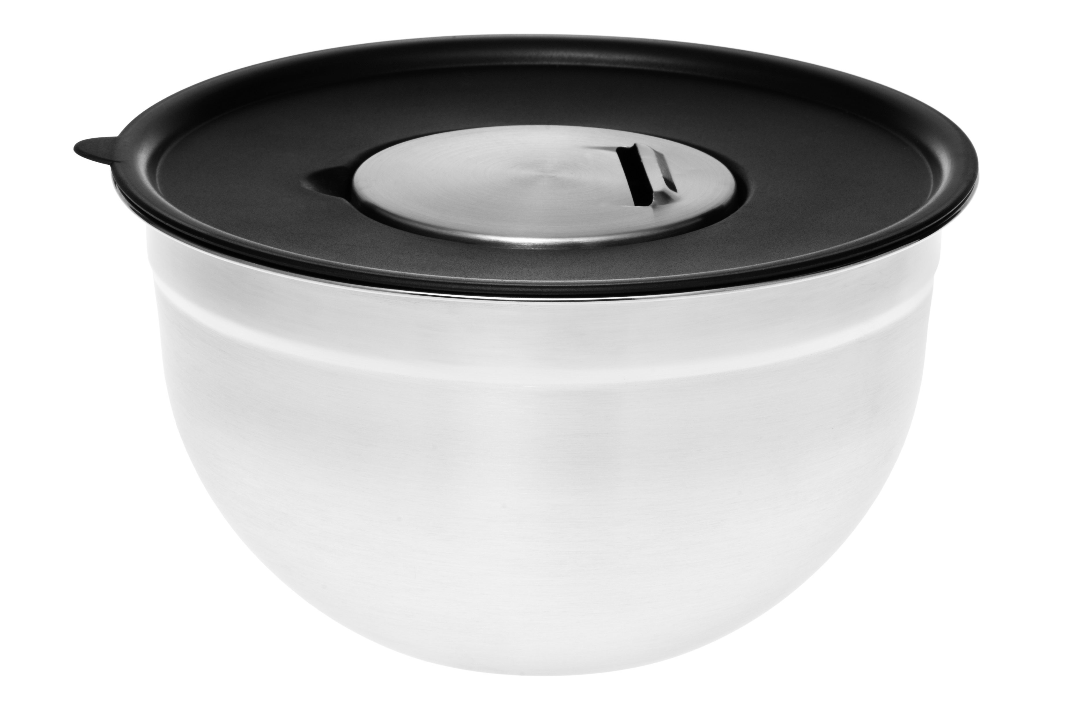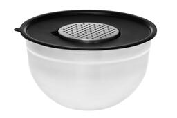 ОписаниеМиска диаметром 24 см, высотой 14 см и объёмом 5 л, которую вы можете использовать для маринования, взбивания, перемешивания и хранения продуктов. Дно из силикона, предотвращающее скольжение. В комплекте три терки и дуршлаг диаметром 20 см. Можно мыть в посудомоечной машине.
