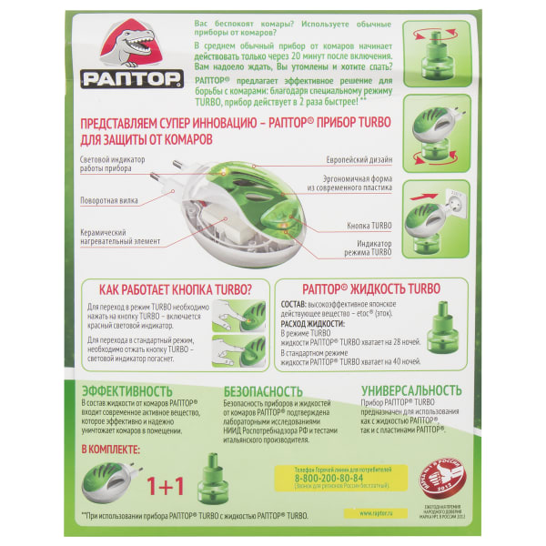 Комплект Раптор Turbo: фумигатор + жидкость без запаха, 40 ночей